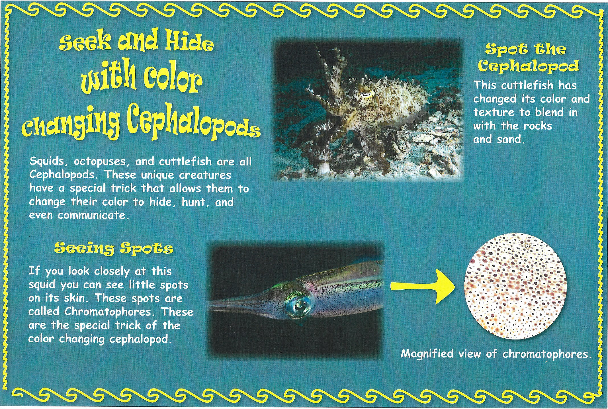 In my Undergraduate career I focused on interpretive graphic design to promote science to the public. The porpse of this is to be an eye catching sign in aquarium facilities. The dark colors are suitable for the dim lighting in aquariums for easier legibility. Unfortunatly I have misplaced the thumbdrive with the original png file.